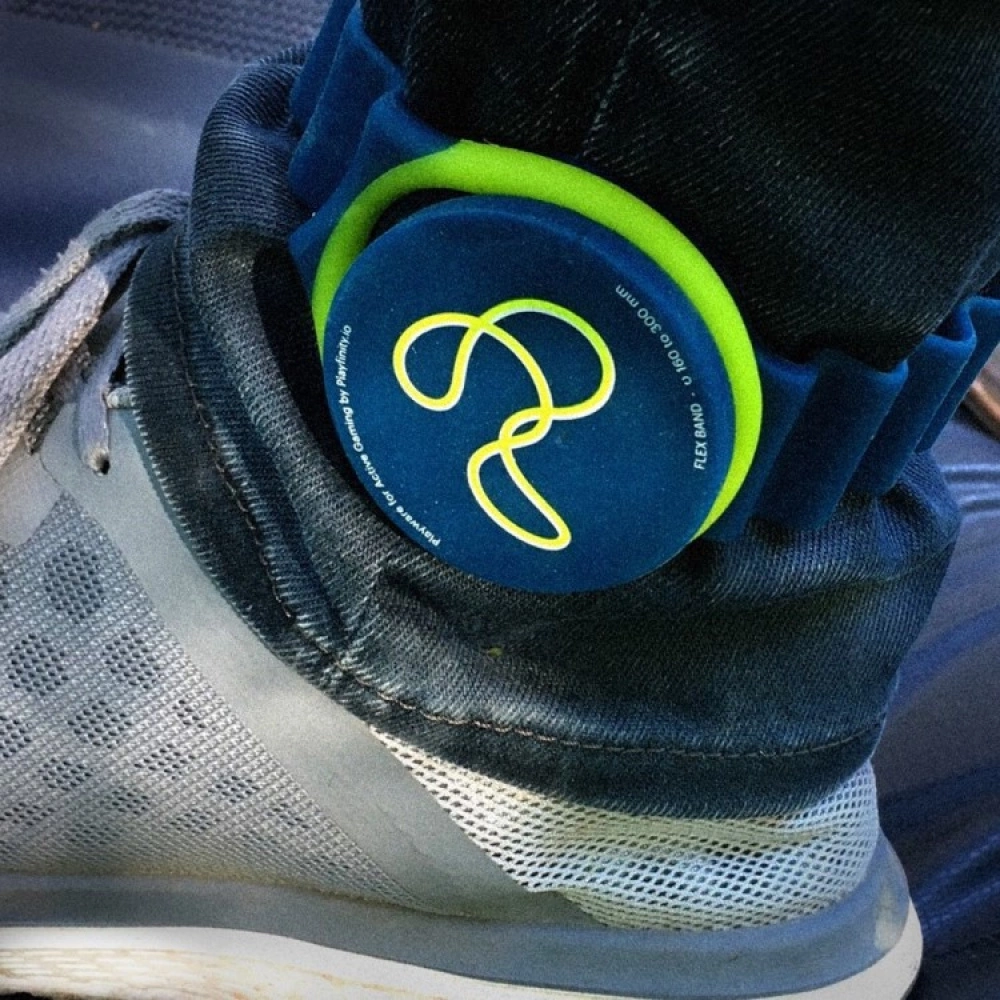 JumpGames consists of a wrist band and a Playfinity game console. Pair the game console with your phone and download the Playfinity app. Attach the small game console to the wrist band and place the band around the wrist of one of your legs. Start up a game and begin jumping!