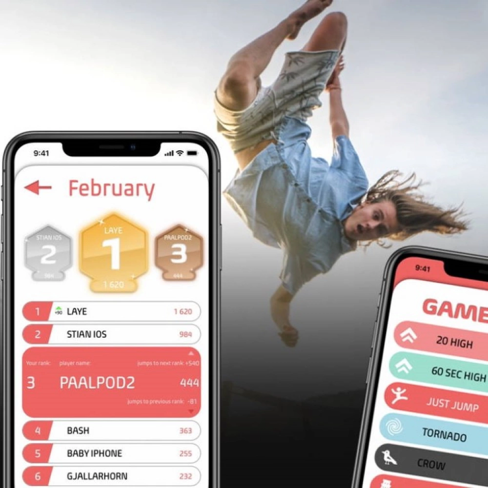 The small game console registers all your movements and can, among other things, read how many jumps you do, how high you jump, and how many laps you turn. Your session on the trampoline is registered in the app so you can compare it against your previous sessions.