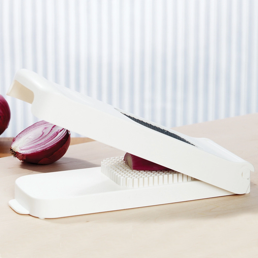 The chopper features a unique construction with a criss-crossed grid of sharp blades that can slice through an onion with ease. The stainless steel knife cuts 6×6 mm pieces. This innovative onion chopper is easy to use and simple to clean. Dishwasher safe.