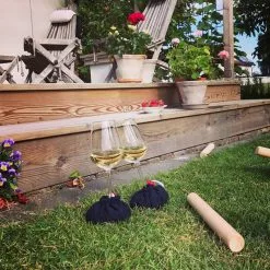 The wineglass holder Vingel is a small sand-filled bag that gives your wineglass enough balance to be able to stand up straight even on rough terrain. Put the wineglass inside the foot and pull the string. You can now put the glass down even on the beach, in the grass, and on cliffs.