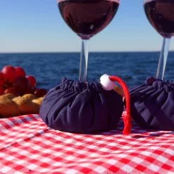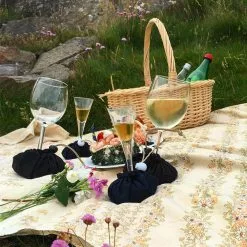 The wineglass holders make it easy to put down your glass while taking a drink at the beach, having dinner on the cliffs, or preparing a picnic in the park. The small sandbags are easy to bring along in the picnic basket and easily attached to the glass.