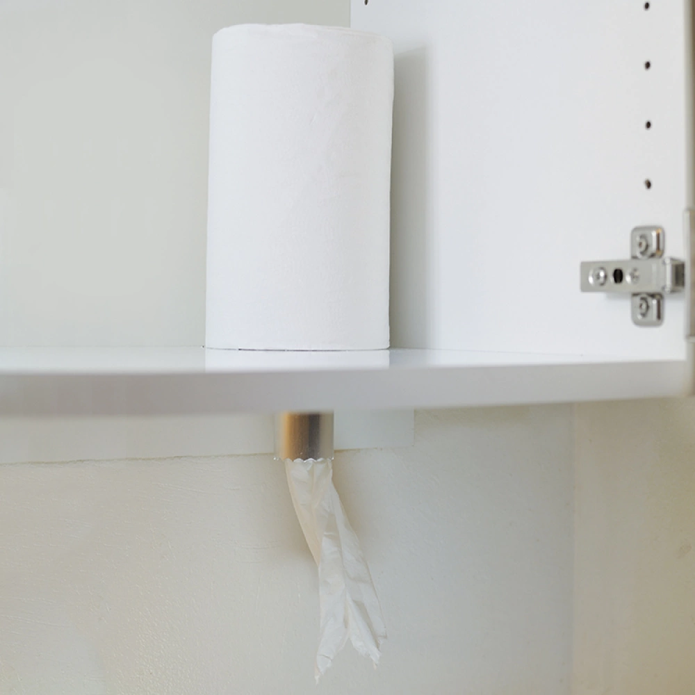 Measure where you want the roll to sit and drill a 40 mm hole in the lowest shelf in the cupboard. Push the pipe through the hole, pull the paper through the pipe and put the roll over the top of both. You can now easily pull out the paper as it is hidden within the cupboard!