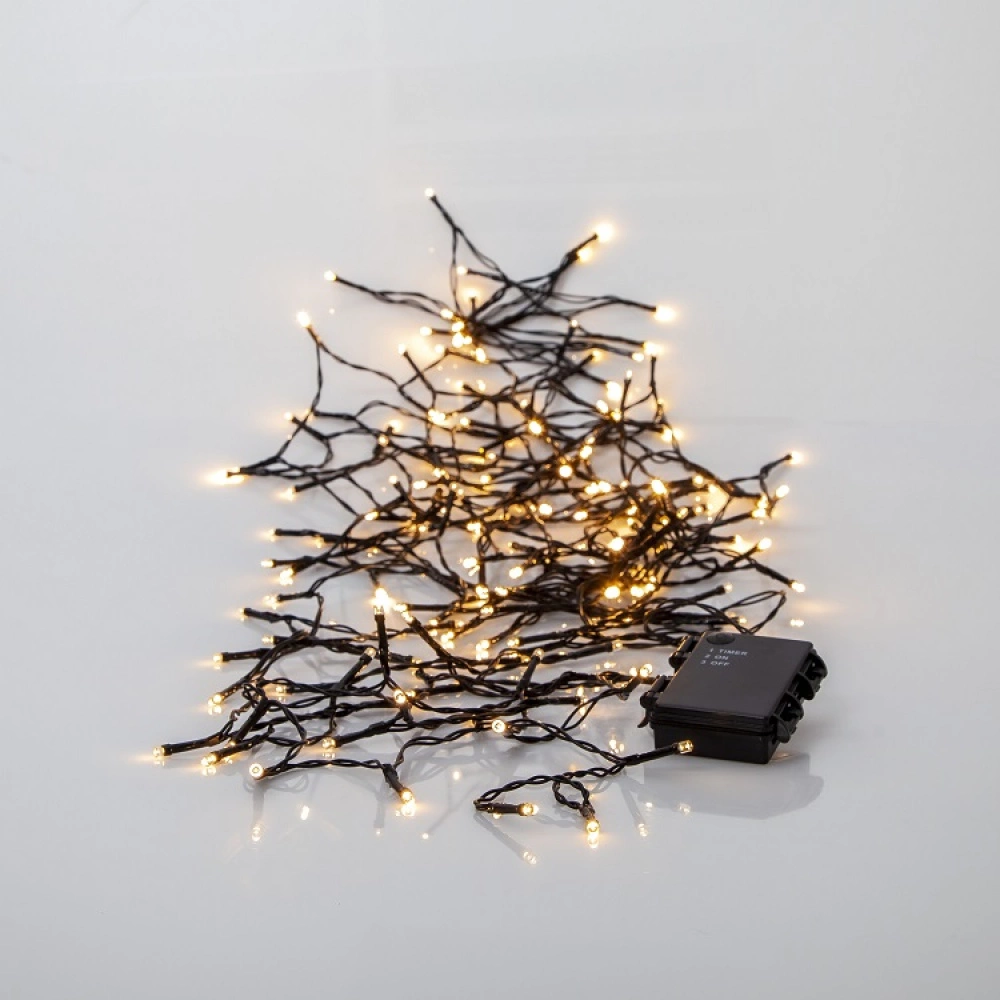 The fairy lights run on 3 AA batteries (not included). Thanks to the built-in timer and the energy efficient LED bulbs, you will only have to change the batteries every three weeks.