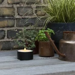 The battery-powered garden candle is made of black sheet metal and wax. Avoid placing the candle in direct sunlight on hot days, as the wax risks melting from the heat.