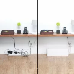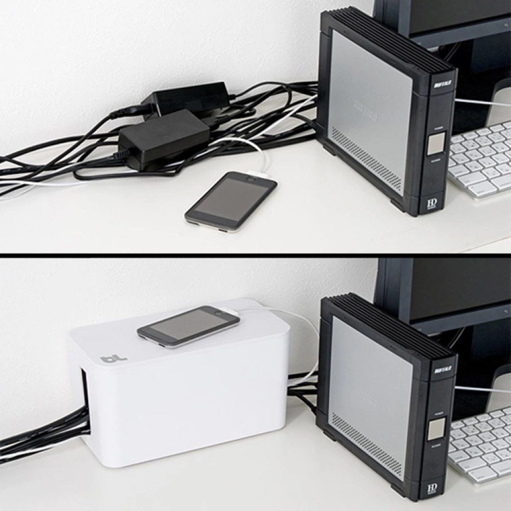 Both the boxes’ short sides have holes so that you don’t have to unplug everything from the power strip before putting it in the box. Using a cable box to store power strips and cords prevents them from gathering dust. It also makes it easier to vacuum-clean as you can move the entire box at once.