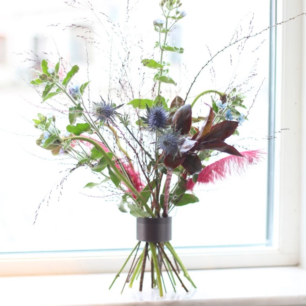 With the bouquet holder Hanataba, you can create professional bouquets on your own. Insert the flowers through the holder, make a little twist, and you have created a spiral formed bouquet with a lot of volume. Lovely to put in a vase but can also stand by itself on a saucer with water.
