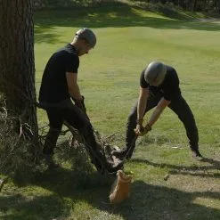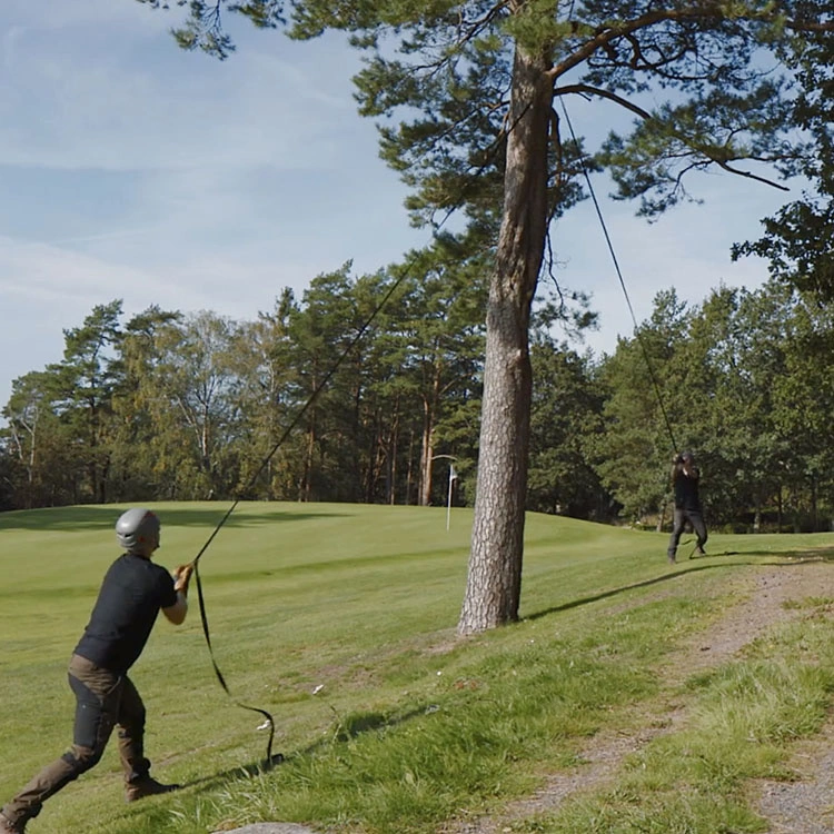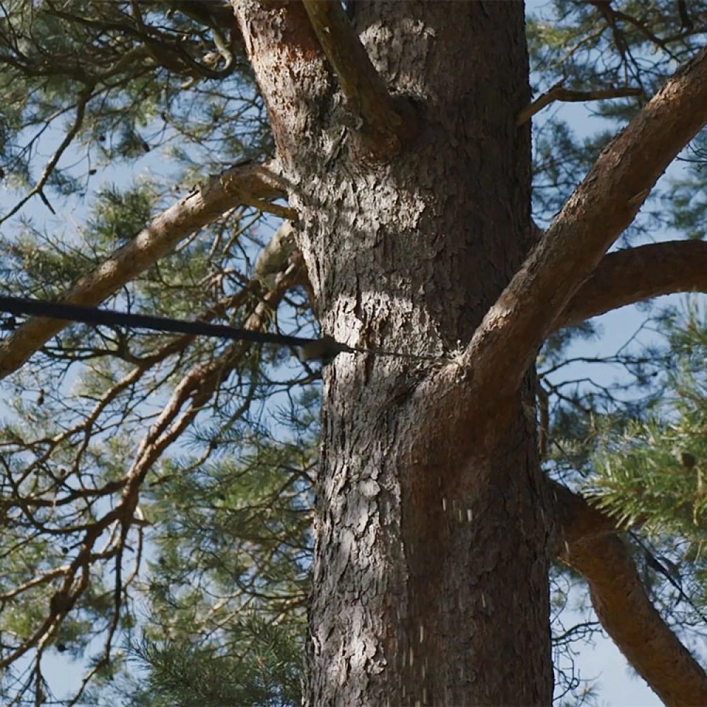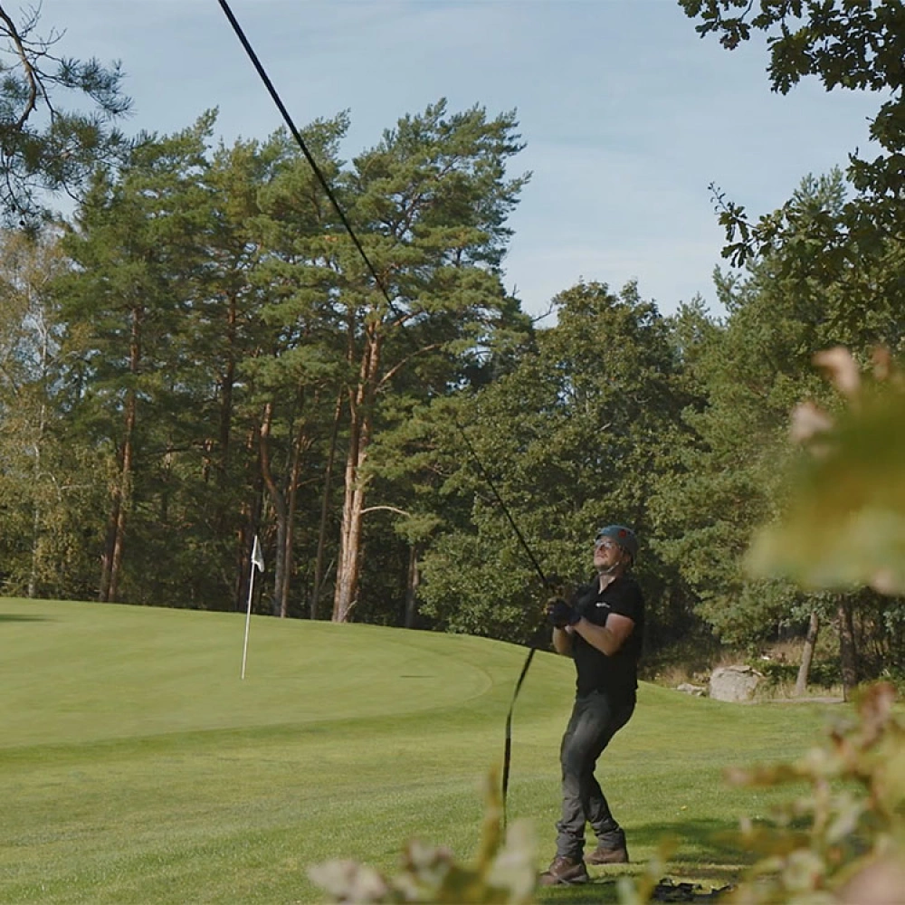 With the Swedish-developed branch cutter kit named Nordic Pocket Saw Arborist, two people can saw off branches without having to climb up the tree or use ladders. The branch cutter kit has long straps and a sharp chain saw that allows you to saw off branches with an altitude of up to 8 m over the ground while standing at a safe distance from falling branches.