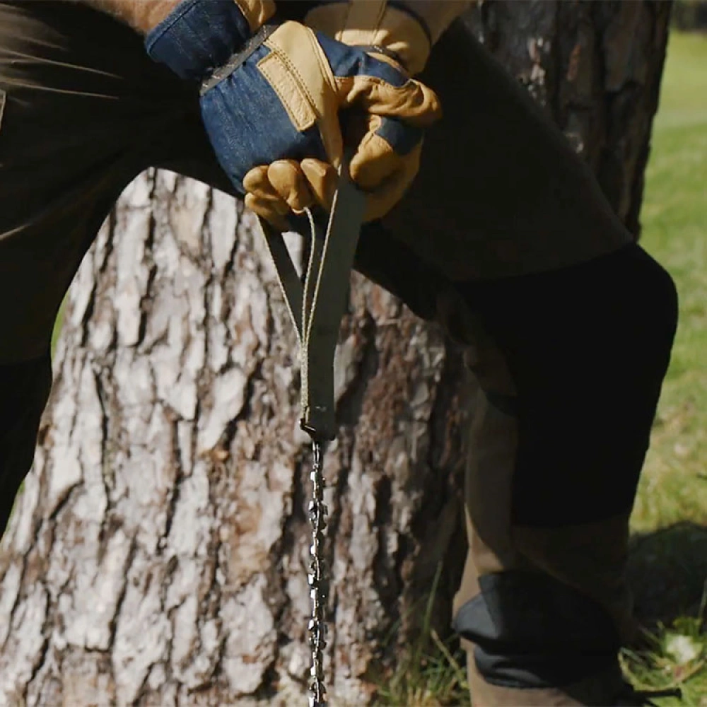 The sturdy handles give a solid grip and makes it easy to draw the chain saw back and forth. The sharp chain saw has teeth on both sides, so it does not matter how the saw aligns itself when you throw it over the branch.
