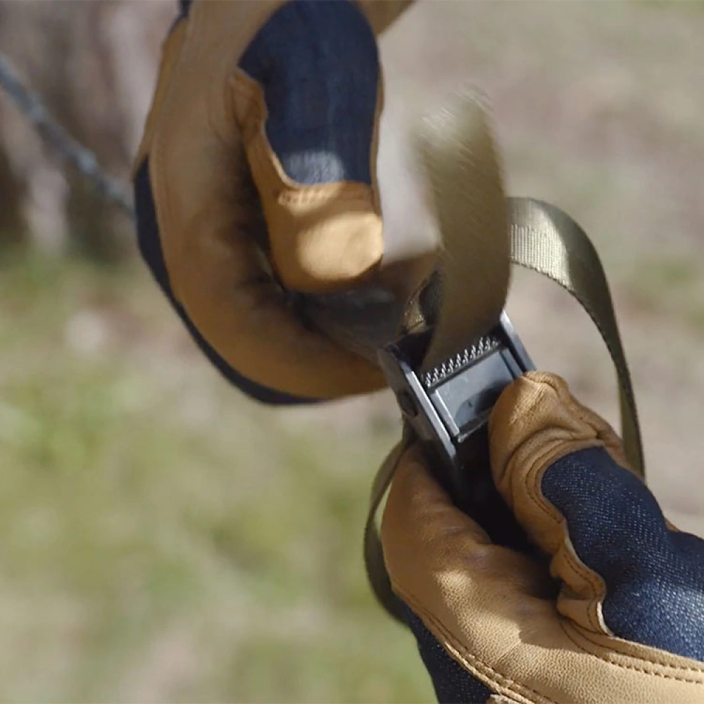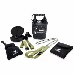 The main components of the branch cutter kit are a super-sharp chain saw and 2pcs of 10 m long straps. Using the weight-bag and the long straps, throw the chain saw over the branch. When one of the straps comes down on the other side of the branch, attach the accompanying handles and start sawing.