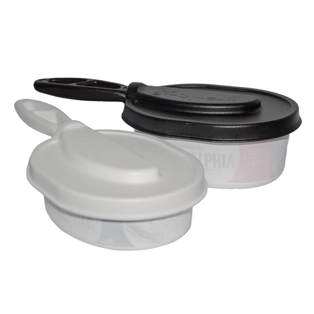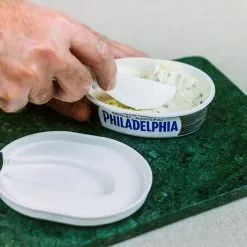 Brelock Philadelphia is a smart lid with an accompanying butter knife that ensures that you always have a knife to spread the cream cheese with. The spread lid replaces the existing lid and fits 175-300 gram sizes of oval cream cheese packaging from the Philadelphia brand.