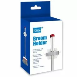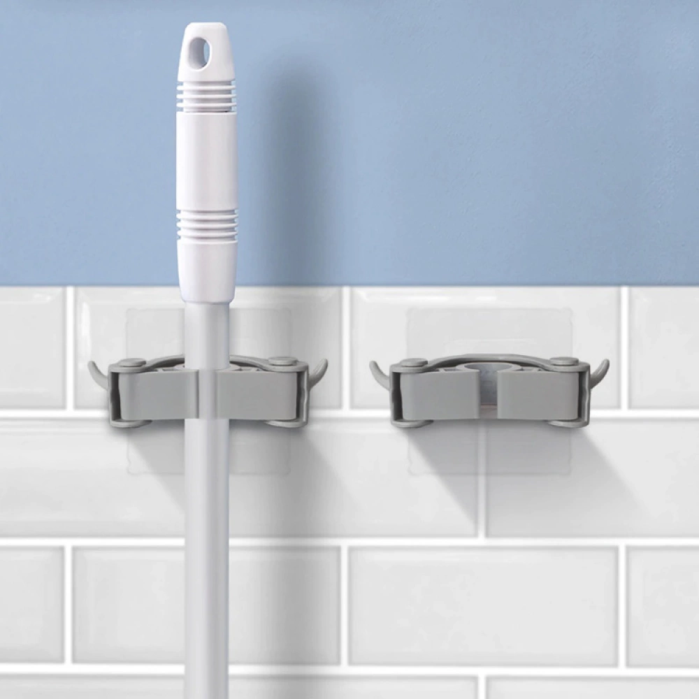 The self-adhesive holder has a soft, flexible rubber grip to hold cleaning tools in place. It fits handles between approximately 2 cm and 2.5 cm in diameter, allowing it to hold most standard-sized mops, brushes and brooms.