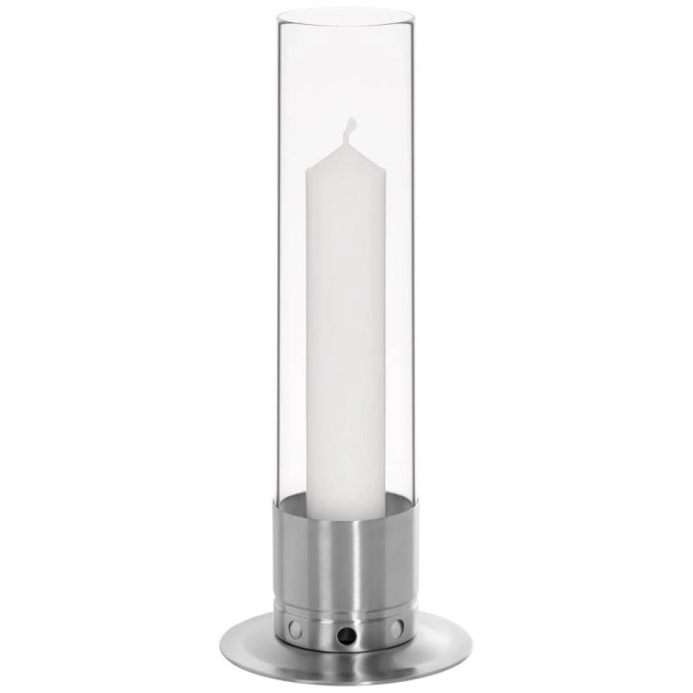 Candle holder with storm glass Large is the wider and taller model of the Swedish-designed Kattvik candle holder. The beautiful candle holder is equally good for indoor and outdoor use and has a storm-proof glass that protects the light from being blown out. The base of the candlestick is made of stainless steel and is available in several beautiful colours and finishes.