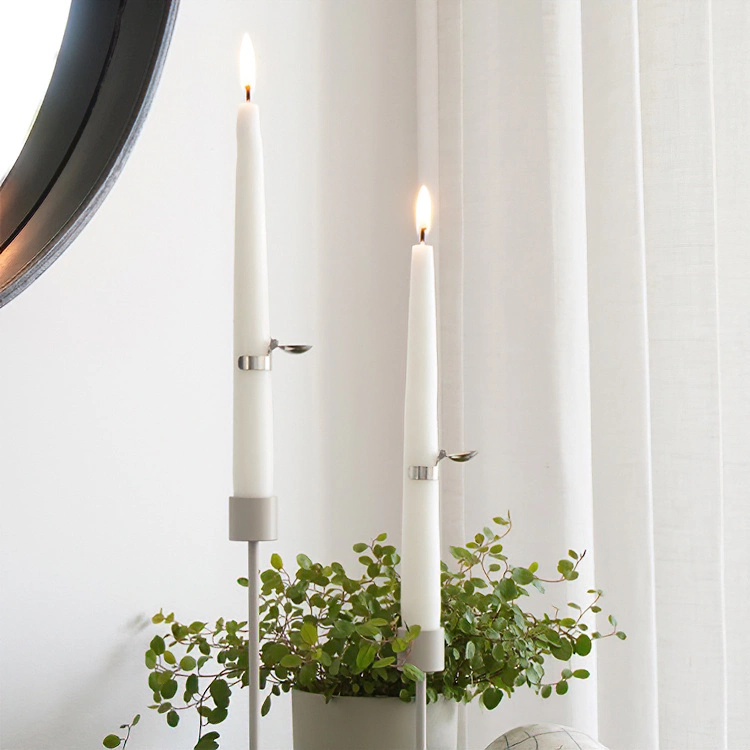 Set the snuffer on the candle by opening the lid and slip the snuffer over the candle. When the snuffer is correctly mounted, the lid should stand straight up. If the candle burns down to the level of the snuffer