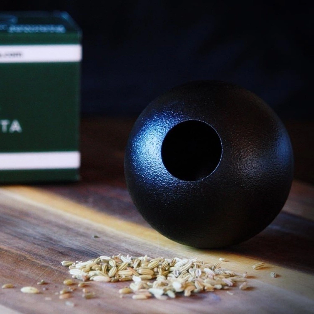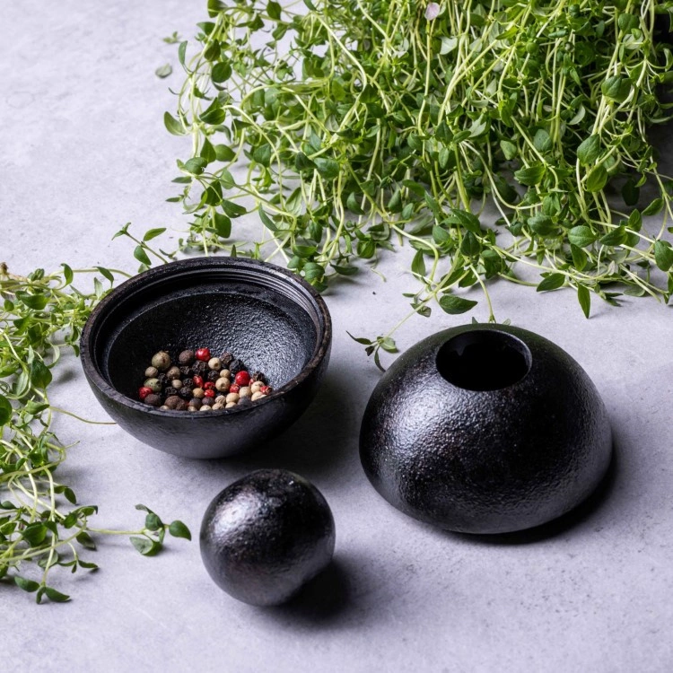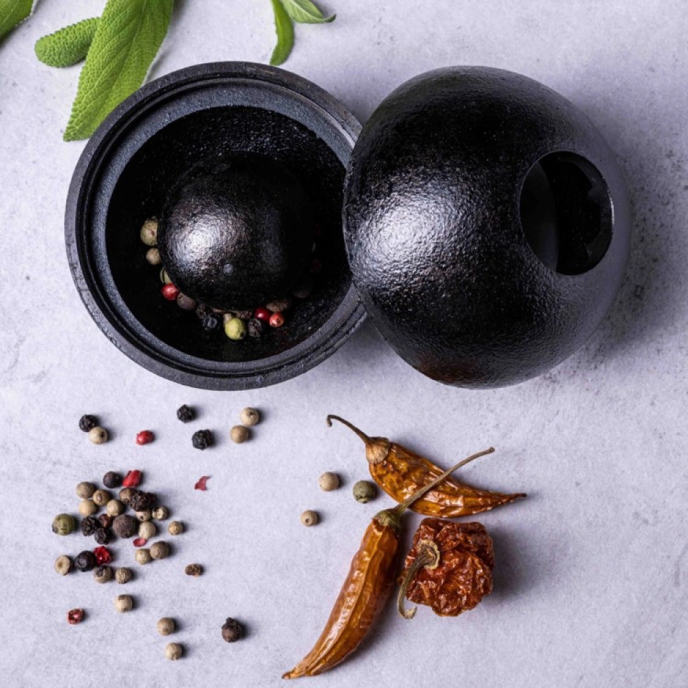 Gravitas is a Swedish-made cast iron mortar that utilises the natural weight of cast iron to crush spices to the desired size. The globe-shaped mortar fits in your hand and pounds, crushes and grinds spices using a heavy iron ball that rolls around inside the mortar.