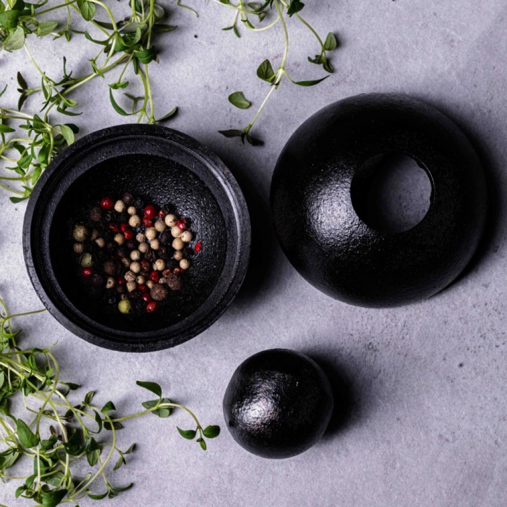 The patented design of the Gravitas mortar is designed by John Andersson and produced by Lursta Cast Iron in the Lyrestad foundry. The mortar is hand-forged in 100% recycled cast iron from locally recycled metal. The cast iron is then fired with three layers of locally produced, certified and cold-pressed rapeseed oil.