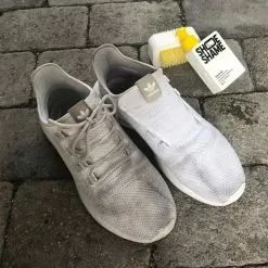 Before you start scrubbing your trainers, make sure that they are dry and that there is no loose dirt on the top or gravel under the sole. Then squeeze out a little gel onto the brush and moisten it in water.