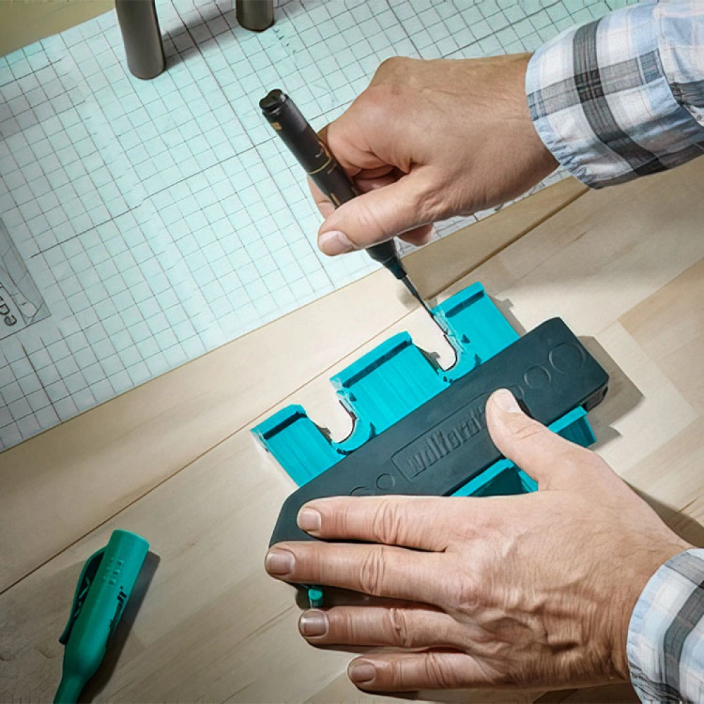 The contour template is produced by the German family company Wolfcraft, formed by Robert Wolff in 1949. Wolfcraft is a big producer of tools, accessories, and self-developed products.