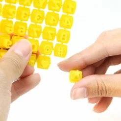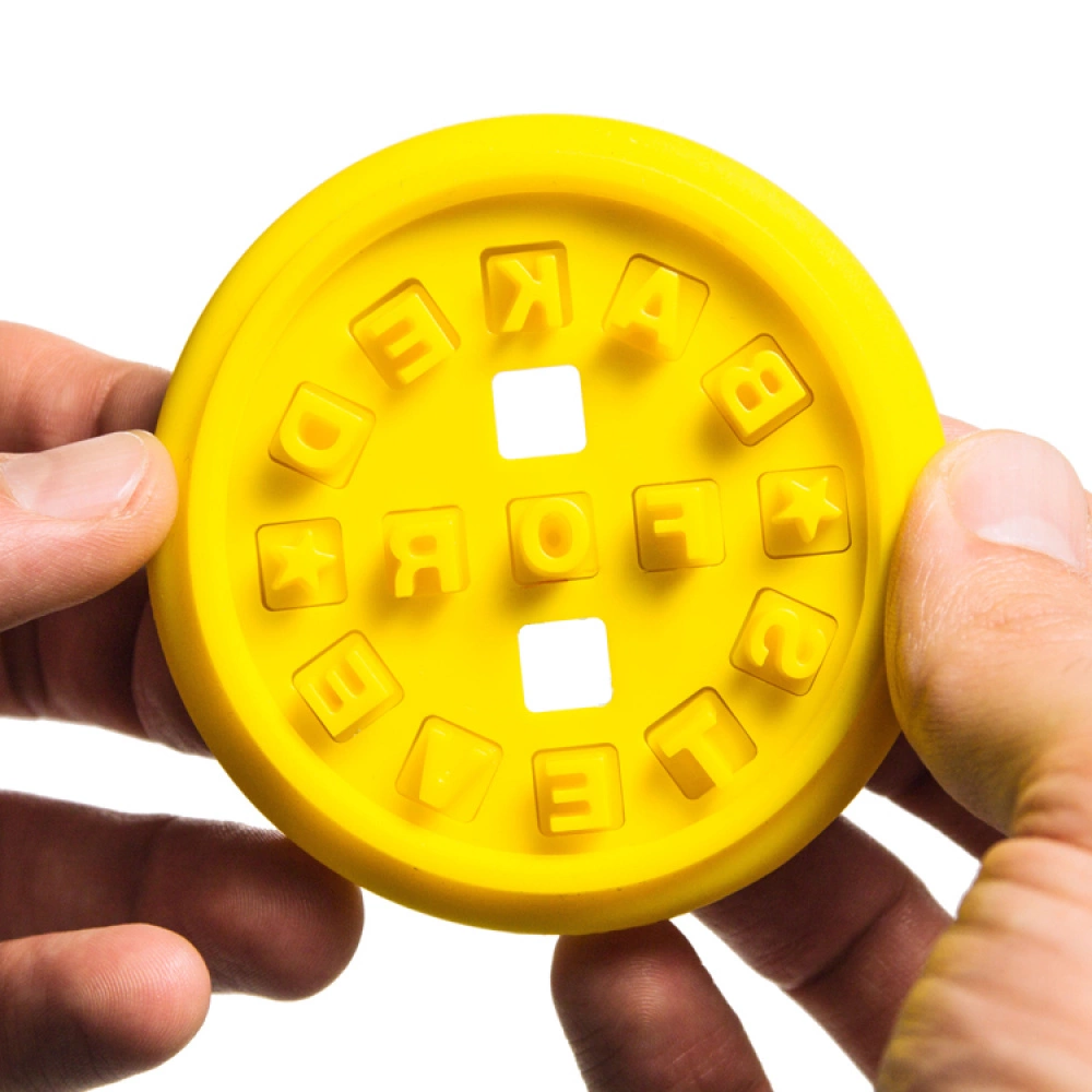 With 84 interchangeable characters including letters (A-Z), numbers (0-9) and characters (hearts, stars, ! ,?, #), you have tonnes of opportunities to stamp quirky and personal prints. The biscuit stamp has space for 17 characters ? 12 around and 5 inside the outer circle.