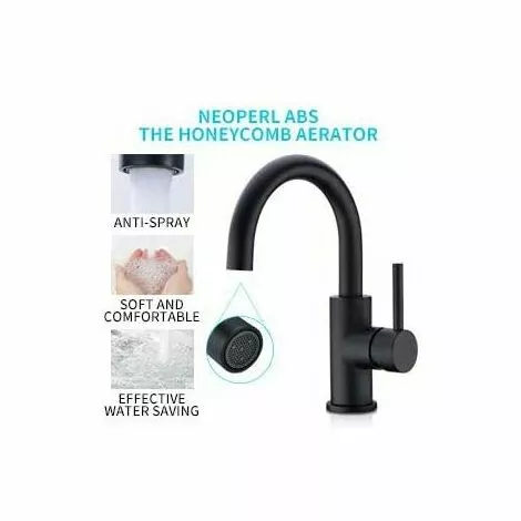 EASY TO USE: Black faucet can easily be rotated 360°. Perfect for two sinks. This black mixer is suitable for small kitchens and bathrooms. HIGH QUALITY: Black kitchen faucet is made of 304 stainless steel. The black coating also prevents corrosion and makes cleaning easier. No water spots or fingerprints. WATER SAVING: Thanks to the Swiss Neoperl honeycomb aerator, the black bathroom mixer tap saves more than 30% water. The ABS aerator is removable and easy to replace. EASY TO INSTALL: The standard 3/8 flexible connection hoses . They ensure the safety of drinking water. The connection hoses are already installed on the black kitchen sink taps.