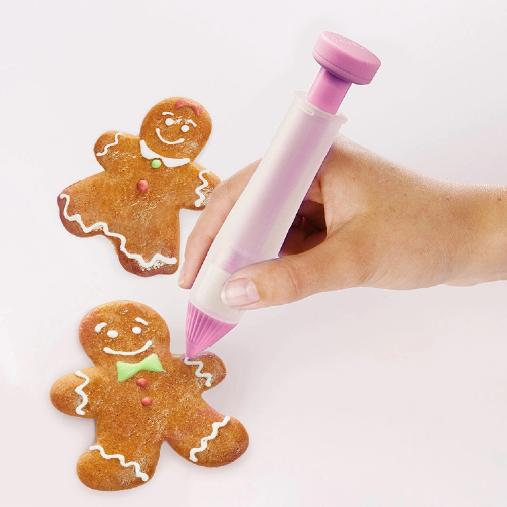 With a decoration pen it is easy to make beautiful designs on cakes, cookies, and plates! Fill the pen with chocolate sauce, icing or other garnish and be in full control of your decorations.