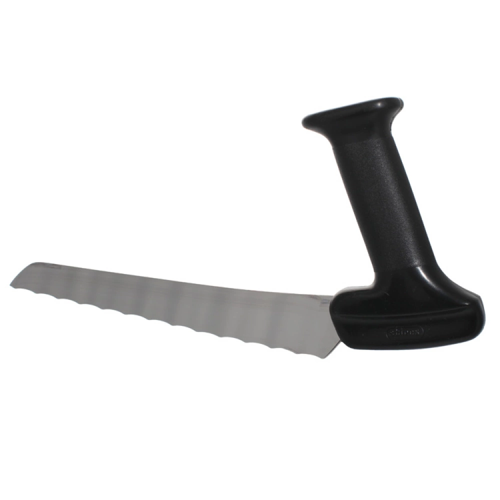 The handle is positioned over the blade for an ergonomic grip that uses your whole arm. This is helpful if your hands are weak. The serrated stainless steel blade cuts easily through bread, vegetables or roast beef.