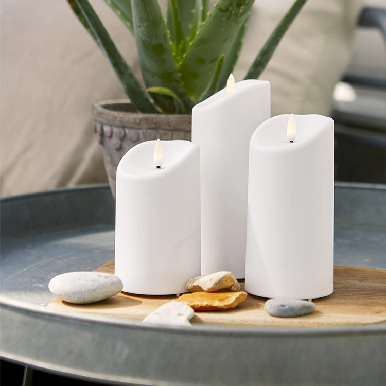 The pillar candle is made of plastic and has a diameter of 7.5 centimetres.