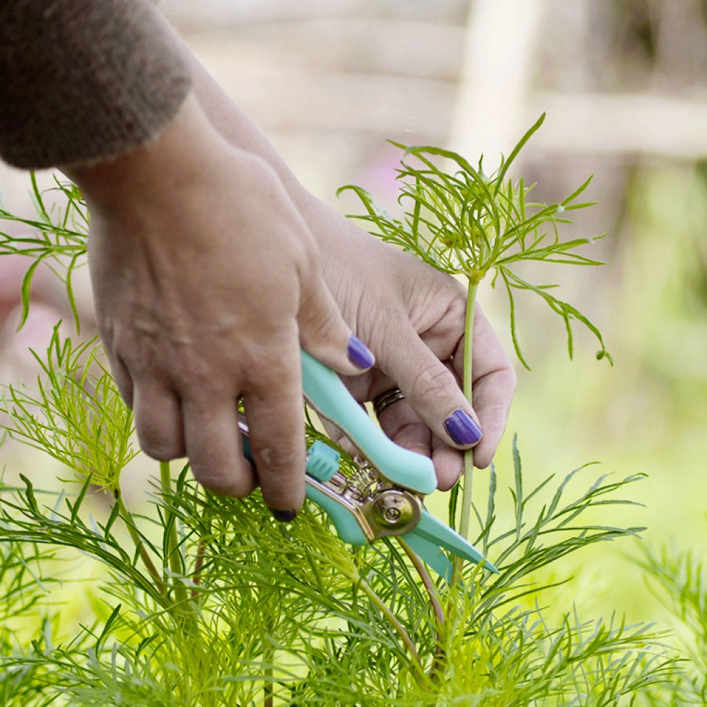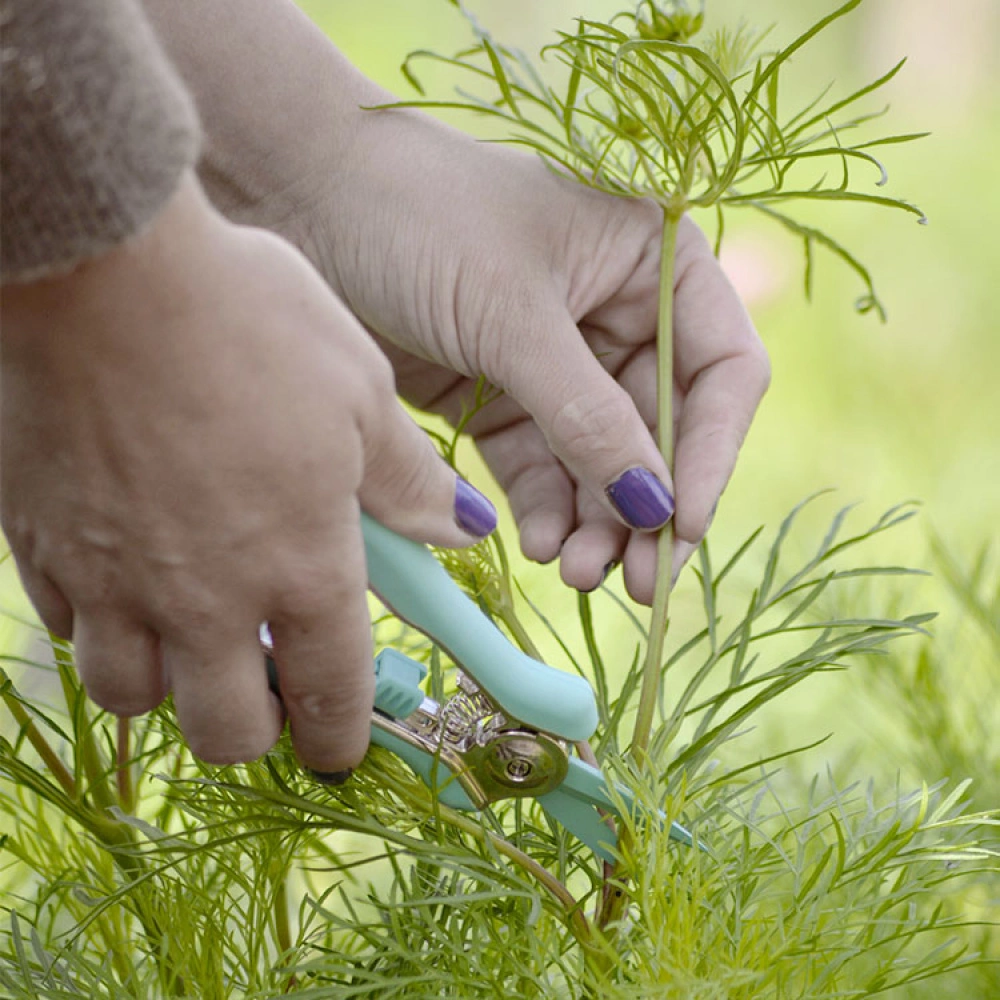 It is important to remember that the flower shears are scissors and not secateurs. The sharp garden shears can easily cut stems from cut flowers and rice, but should not be used to cut branches.