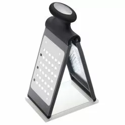 The grater can grate finely or coarsely and there is also a zest grater, which is perfect for when you want to grate some lemon or lime zest. The sturdy handle gives you a good grip and the rubber feet ensure that the grater doesn’t slip on the cutting board once it is unfolded.