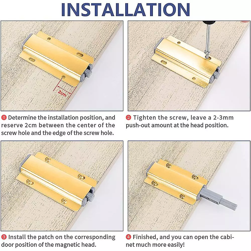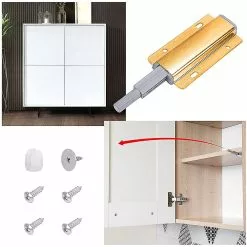 5.What You Get: 4 x Gold Push to Open Latches; 16 x Base Mounting Screws; 4* Flat head screws; 4 x Anchors; 4 x Adhesive.