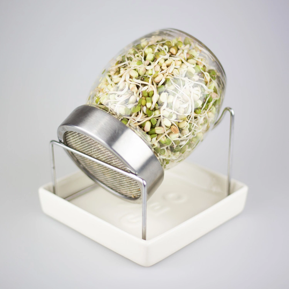 The glass sprouting jar has a practical strainer lid and support for it to rest on during sprouting. Soak the seeds during the night (about 8-12 hours) and strain the water through the strainer. The sprouts should be washed twice a day, morning and evening. Store the jar upside down in the support so excess water can escape and collect in the ceramic base plate. After about 2-5 days the sprouts are done growing and are ready to be eaten!