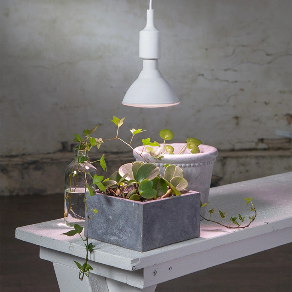 Screw the light bulb into a lamp cord and hang it approximately 10-20 cm above the pot. The grow lamp has a low energy consumption and a long lifespan. The LED lamps do not heat up and do therefore not risk burning your plants.