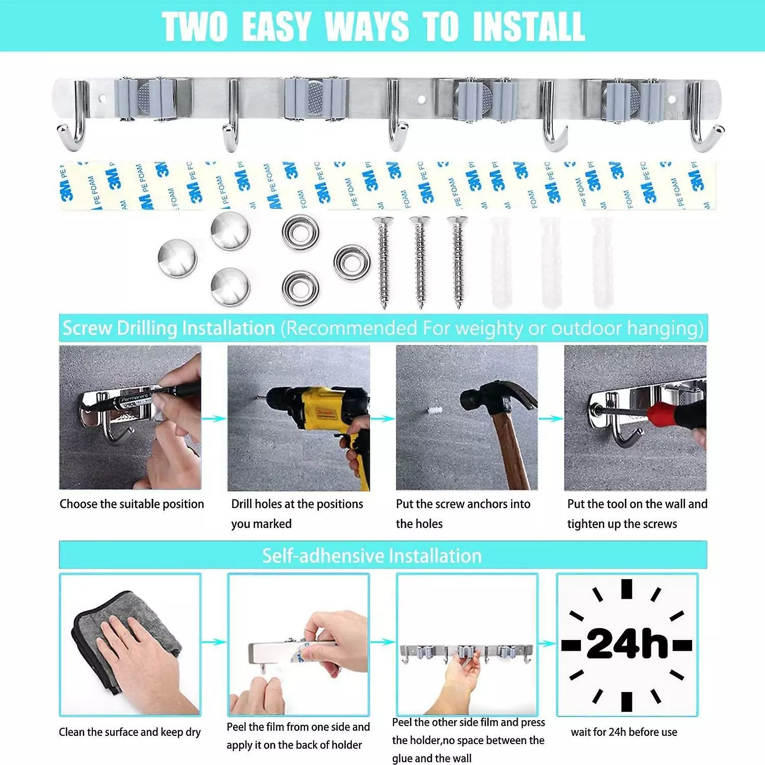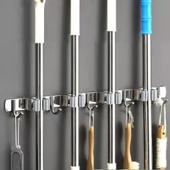1. 4 Slots and 5 Hooks The stainless steel rack has 4 slots and 5 hooks to organize your messy tools and keep your home clean and tidy. This broom bar allows you to tidy up your cellar / garage, laundry room, storage room, cellar, cleaning cabinet, broom cupboard or in your garden shed.