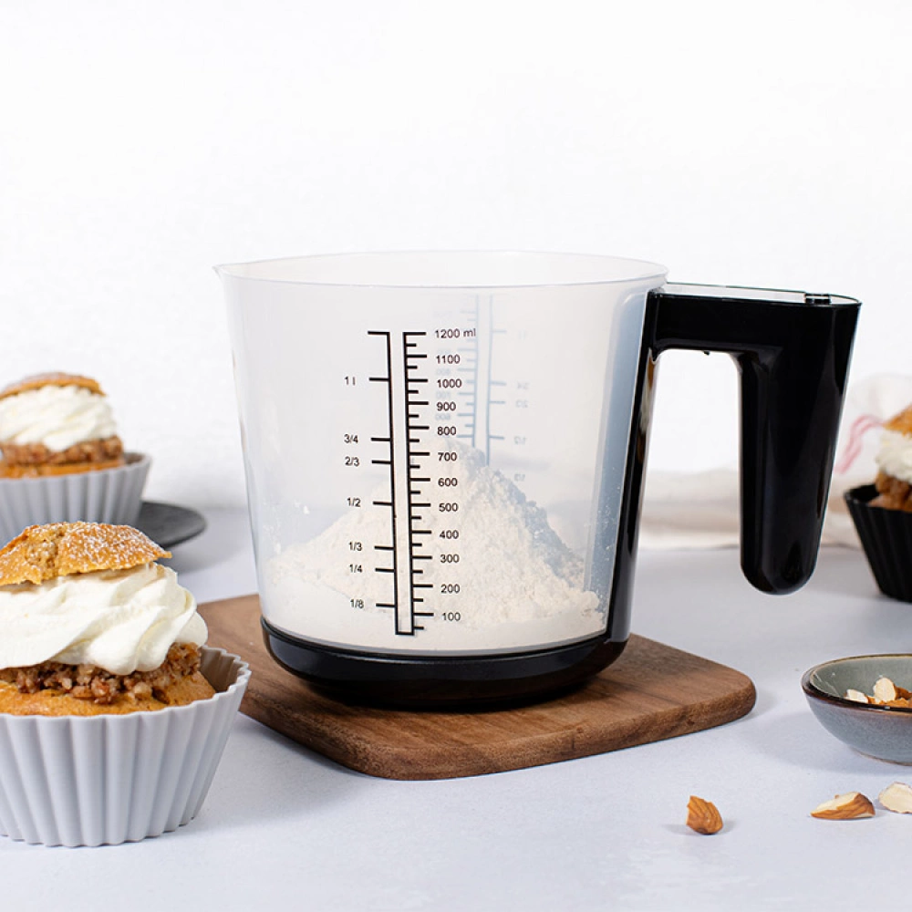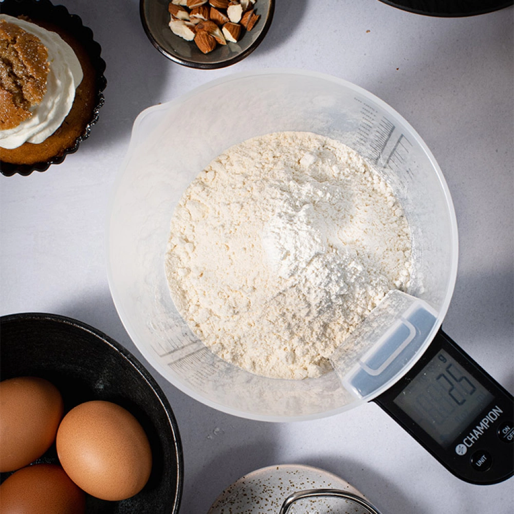 A kitchen scale with a measuring jug is practical to use for both cooking and baking, as it allows you to easily measure both weight and volume with one and the same tool. The removable measuring jug has practical graduations in milliliters and liters on the outside, and the flexible reset function allows you to weigh several ingredients at the same time.