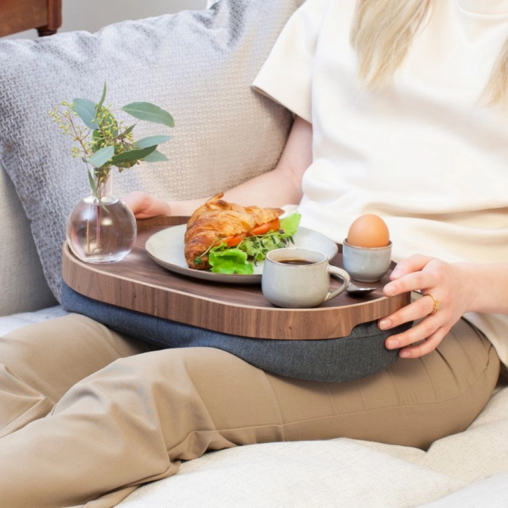The soft cushion underneath rests comfortably against your legs and the adjustable padding can be moved around to adjust the angle of the tray. The cushion detaches from the tray and has a removable cover that can be washed.
