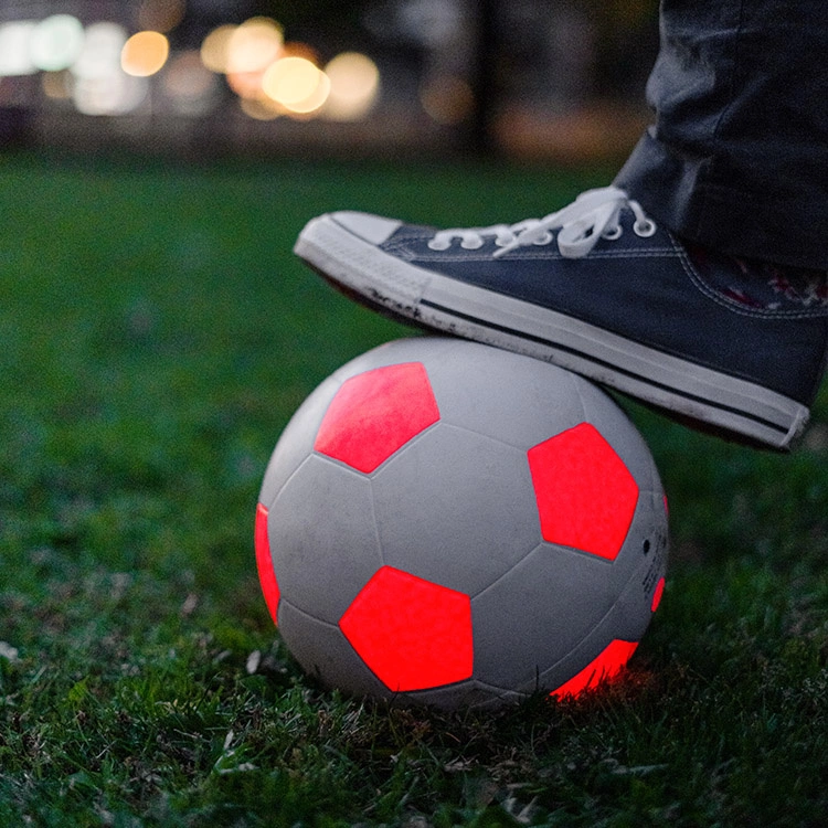 The ball’s two lights are powered by two sets of 3 LR44/AG13 batteries (included). Before the lights can go on, you will need to remove the protective plastic that is attached to the batteries. The lights will then come on as soon as you start playing football.