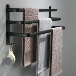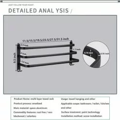 Towel rack three layers: the design of three upper and lower rods can hang multiple layers of towels and bathroom products. dry, which can effectively reduce the growth of bacteria.[High quality material] The surface is made of high quality aluminum alloy, which is lightweight and strong in corrosion. After anodizing treatment, it can effectively prevent corrosion and rust, avoid daily scratches, and ensure long service life. and long service life.[Enough] The thickened fixing bar makes the towel bar more stable and can fix heavy bath towels. It is very suitable for families and modern hotels to hang and organize your towels, bath towels and clothes.[Easy Installation] The hole installation method can be easily installed on the wall. All accessories included, suitable for most walls. Suitable for bathroom, kitchen, living room, etc. The unique design is very easy to clean. clean.[Widely Use] This towel rack is an ideal choice for hanging towels and clothes in the bathroom. For the kitchen you can hang kitchen utensils and tea towels. They can also be used by hairdressers. They can be attached to the wall, saving a lot of space.