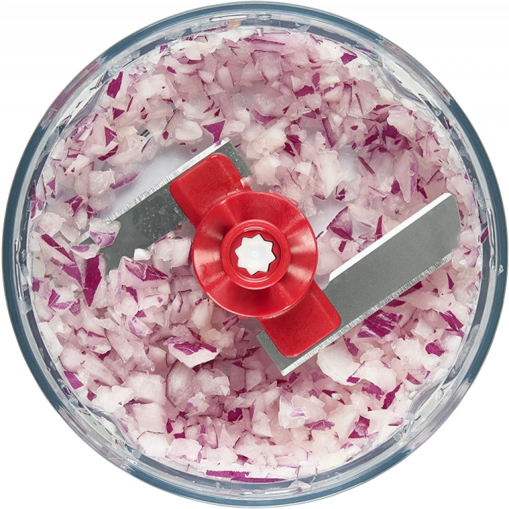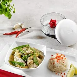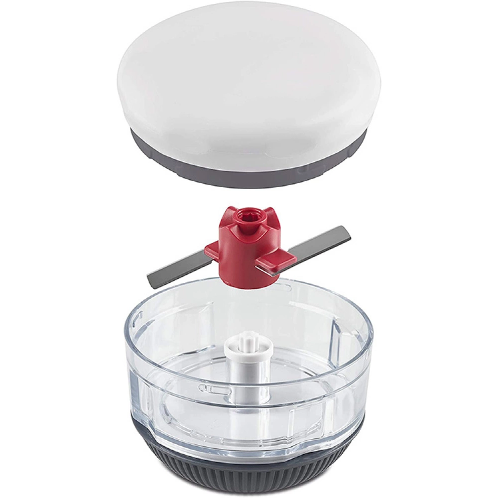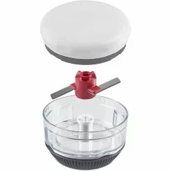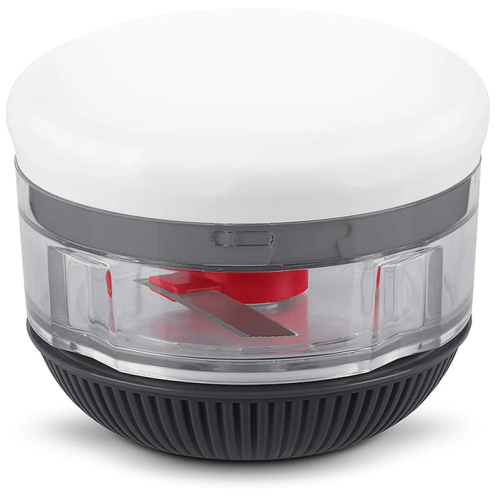 This mini chopper from Zyliss is an easy-to-use vegetable chopper that chops whole garlic cloves, chillies, fresh herbs and shallot pieces quickly. You decide how coarse or finely chopped the pieces should be by twisting or rolling the mini chopper on the table until you get the desired size.