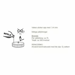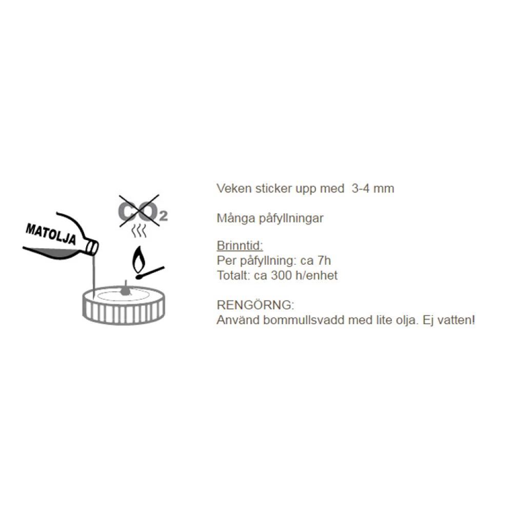 The candle burns with vegetable cooking oil that you pour directly onto the candle. Rapeseed oil is the clearest oil you can use, but both olive oil and sunflower oil will also work perfectly well. One tablespoon of oil will provide about 7 hours of burning time.