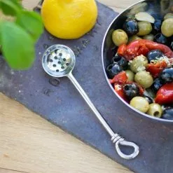 The small perforated spoon is perforated with several holes and works like a slotted spoon. When you pick up olives with the olive spoon, the olive juice and oil can drain through the small holes in the spoon and back into the jar.