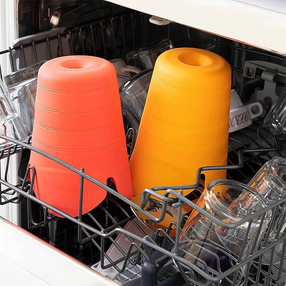 The popcorn bowl is dishwasher safe. Remember to wash it before the first time it is used and after each subsequent usage. After it has been cleaned, it is easily folded up and stored in the kitchen drawer.