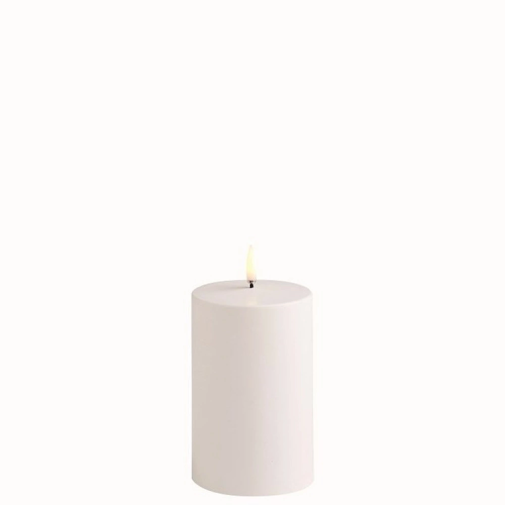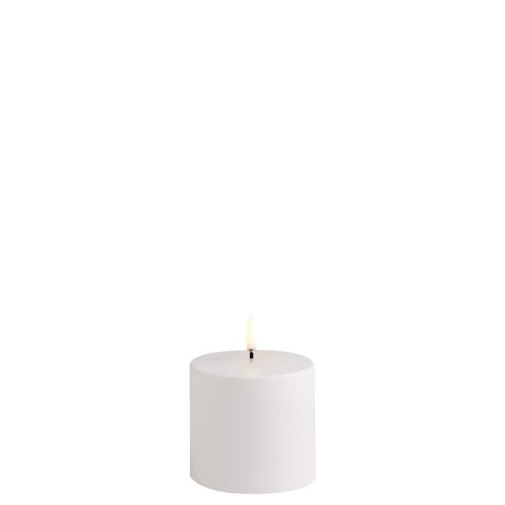 The block candle is made of UV-resistant plastic and can be used outdoors. The light is water splash resistant, which means that it can withstand a little rain, but you may wish to place it inside a lantern to protect it from water and puddles. The light should be taken inside in the event of snow and minus temperatures.