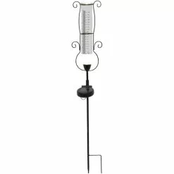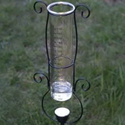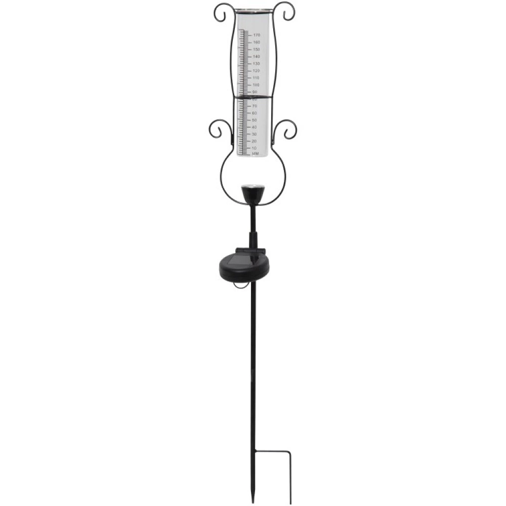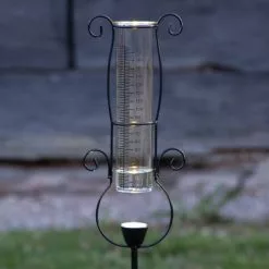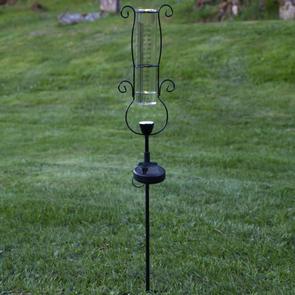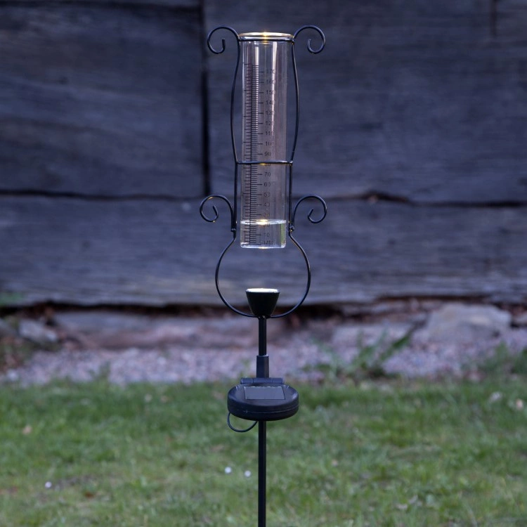 The rain gauge is made of glass and graduated in millimetres (0-176 mm) and inches (0-7 inches). The glass beaker holds about 33 cl and with the help of the rechargeable solar lamp it is easy to read how much it has rained.