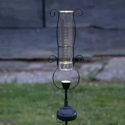 The solar-charged LED light is charged by the sun during the day and automatically turns on at dusk. The light shines with a warm white glow that makes it easier to read the rain gauge and is also a nice point of light in the garden.