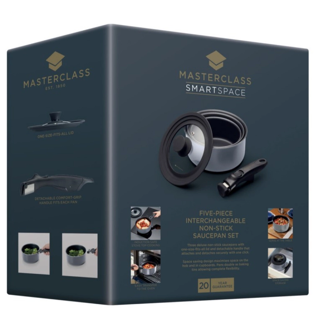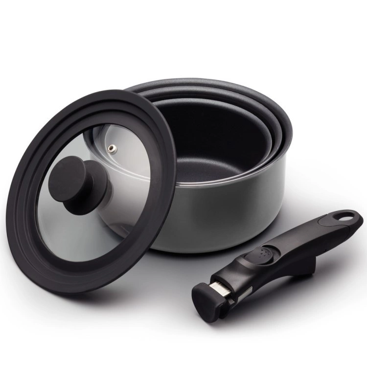 - 3 saucepans, removable handle & universal lid
