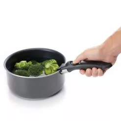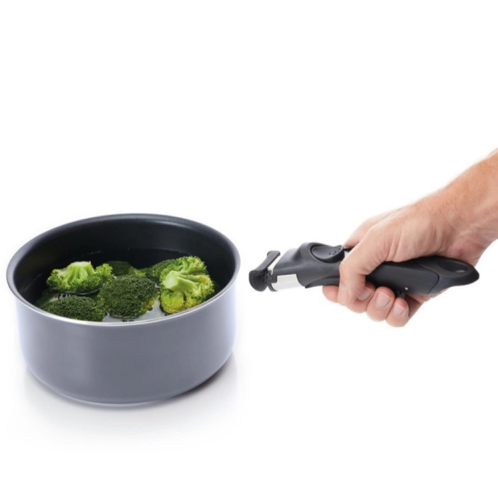The detachable handle is easy to attach and can be quickly moved between pots and pans. To open the handle, pull the button on your thumb towards you. Place the handle over the edge of the pan and press the button under the handle with your fingers. The handle is now firmly attached to the pan.