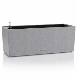 The self-watering flower box is manufactured in Germany by the German company Lechuza. The flower box is made of high-quality and weather-resistant plastic and has a rustic exterior that looks like real stone.