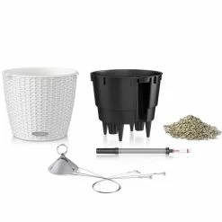 The water reservoir makes it possible for the plant to supply itself with just the right amount of water. Fill the water reservoir by pouring water through the hole at the top of the inner pot.