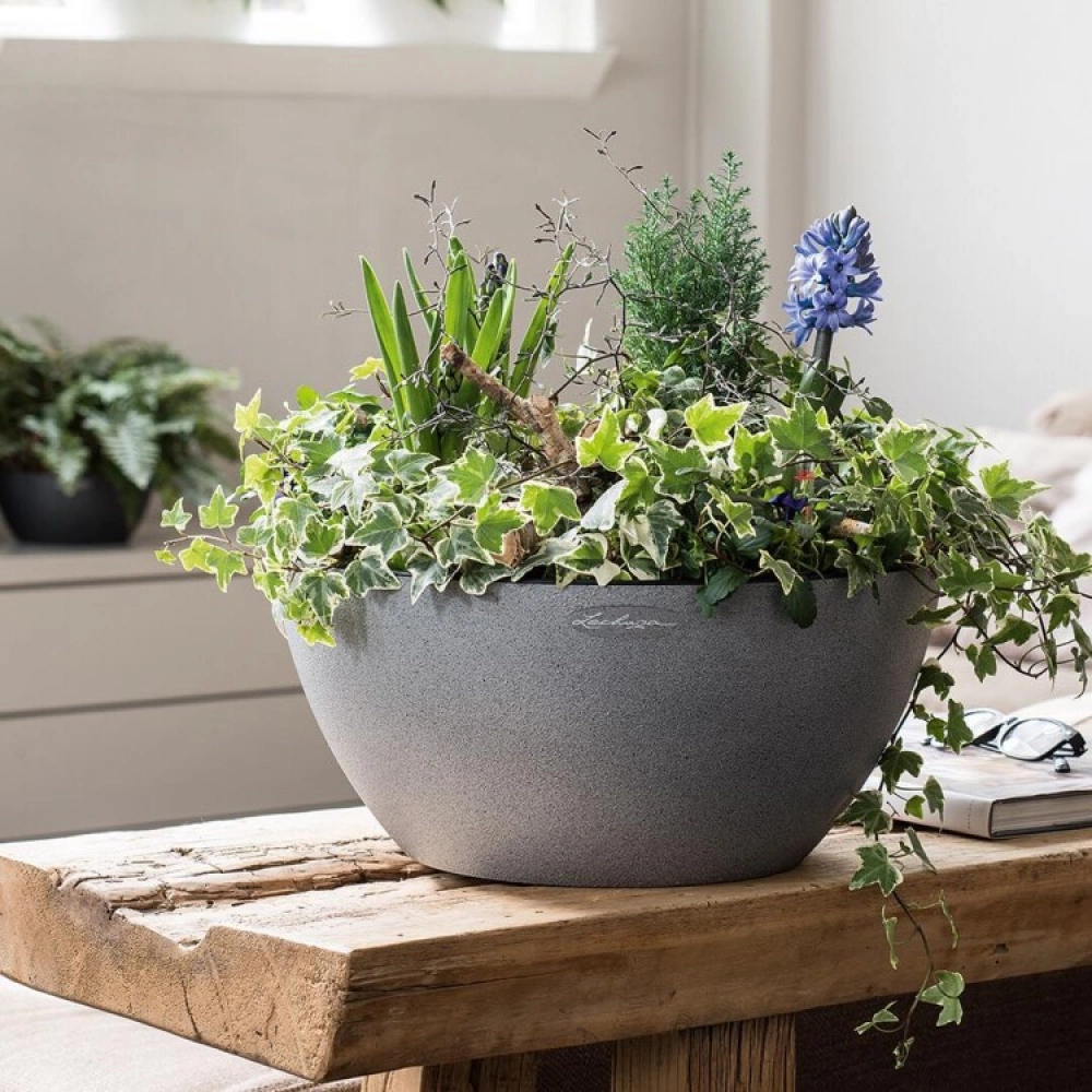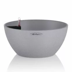 The exterior of the round self-watering pot imitates rustic stone and is made of weather-resistant, high-quality plastic. The pot is manufactured by the German company Lechuza and is available in two sizes.