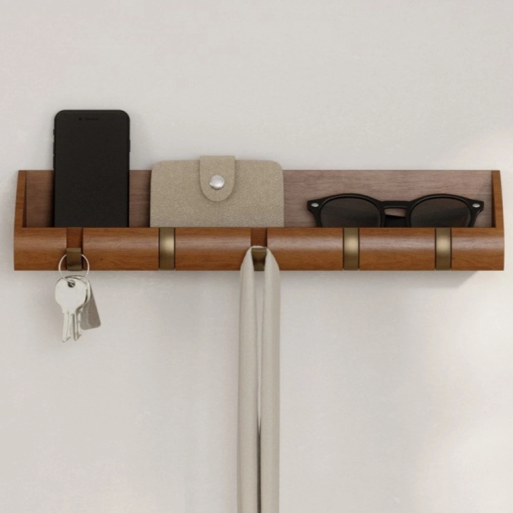 Cubby is a stylish and practical shelf with hooks that allows you to keep your everyday items close at hand as you walk in and out the door. The wall shelf has several fold-out hooks for hanging clothes and bags as well as a well-planned area on the top for storing keys, mail, headphones, mobile phones and other small items.