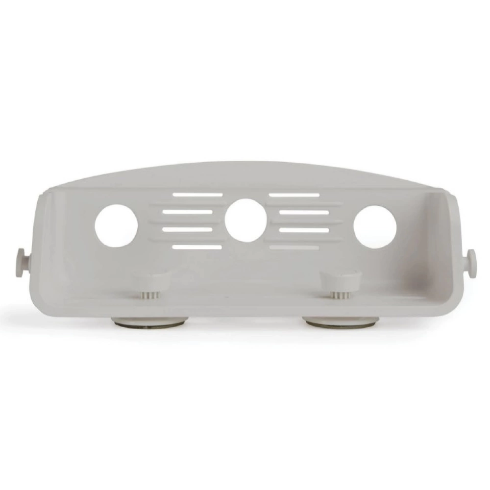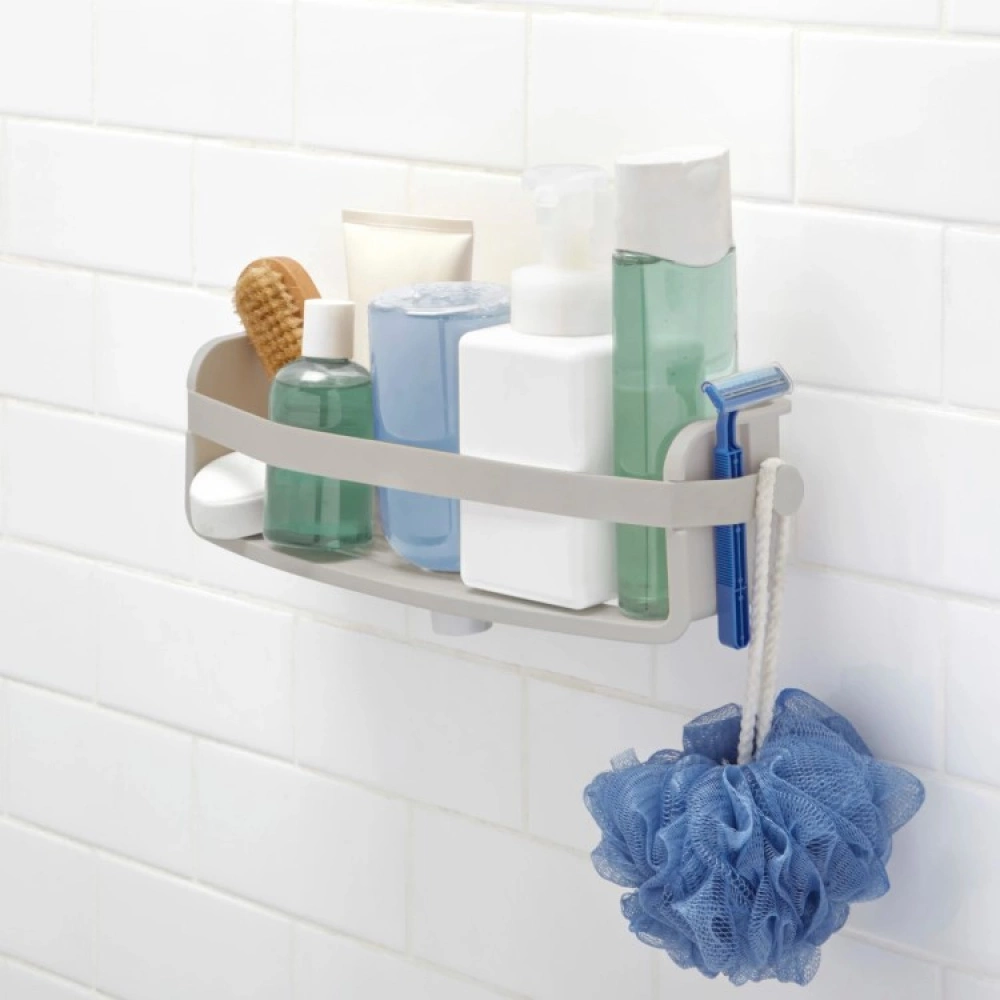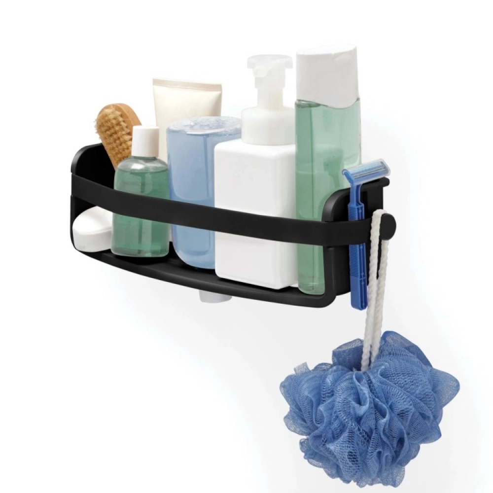 The Umbra shower shelf with suction cups is an easy-to-mount bathroom shelf that you can set up without the use of tools. The shower shelf has space for shampoo, conditioner and shower gel, it has a holder for a razor and two hooks on the sides where you can hang a sponge, for example.